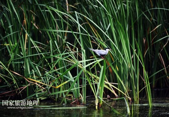 8月3日,一只須浮鷗停在那木斯萊湖中的蘆葦上。