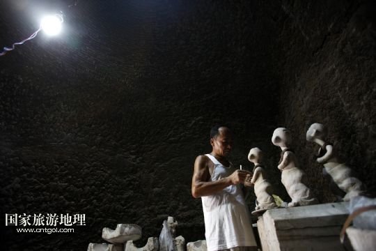 8月5日,山東省淄博市博山區(qū)一名民間藝人在“饅頭窯”里制作陶瓷藝術品。