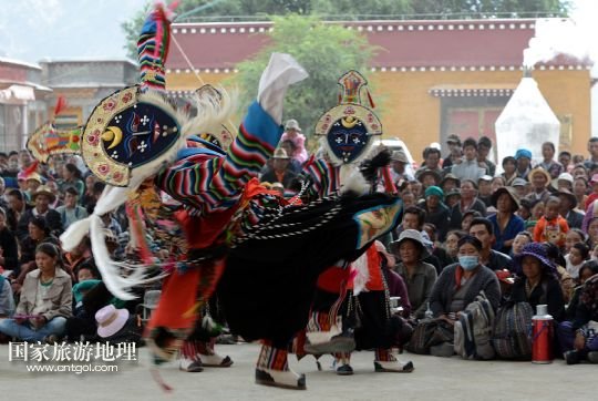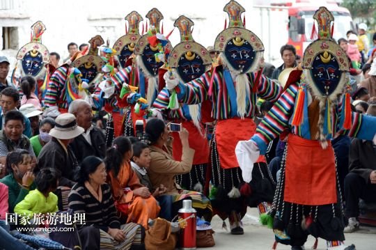 8月6日,在西藏堆龍德慶縣乃瓊鎮(zhèn)甲熱村,覺木隆藏戲團的演員們在村里的雪頓節(jié)慶典上表演。