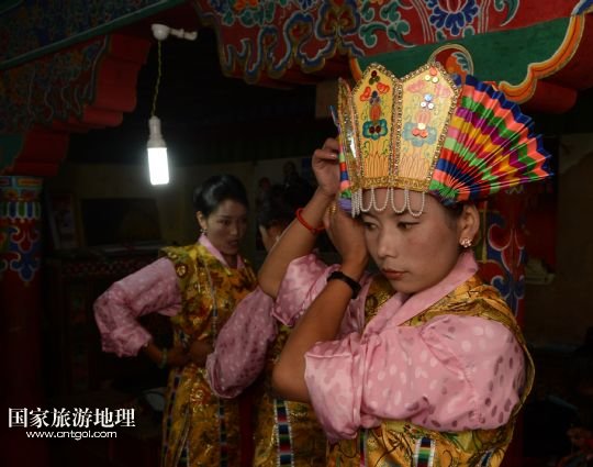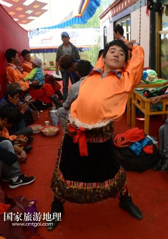 8月3日,在西藏堆龍德慶縣乃瓊鎮(zhèn),覺木隆藏戲團演員次珍在望果節(jié)演出前練習。