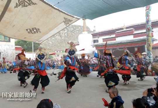 8月6日,在西藏堆龍德慶縣乃瓊鎮(zhèn)甲熱村,甲熱村覺木隆藏戲團在村里的雪頓節(jié)曬佛慶典上表演。