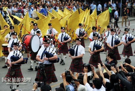 9月30日,蘇格蘭風(fēng)笛樂(lè)團(tuán)在廣西柳州市駕鶴路巡游。