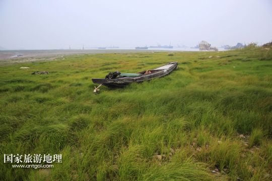 9月19日,漁船擱淺在鄱陽湖江西九江市蛤蟆石水域附近長滿青草的湖床上。