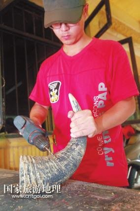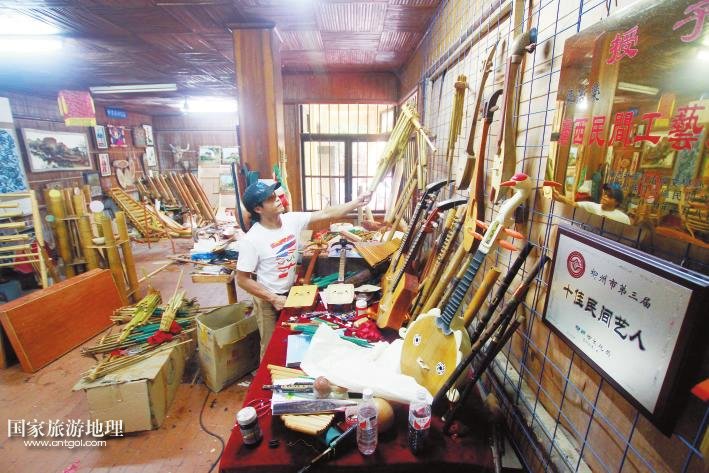 國家旅游地理 廣西柳州11月11日訊(記者陸旺楊春) 牽手漫步龍?zhí)睹琅?,并肩靠背沐浴晚秋暖陽,你會時常聽到一串串動人的音符:它時而渾厚圓潤、清脆響亮,時而輕靈縹緲、悠長凄美。不忍打破這份寂靜閑情,卻又忍不住猜想:這是何方人士,用何種樂器,吹拉彈撥出如此佳音?穿越叢林,循聲走去,瑤寨庭前,幾個年輕男女手握蘆笙,身子左搖右晃,吹得正起興。步入瑤寨一樓才發(fā)現(xiàn),這里儼然一個生產(chǎn)民族樂器的大工廠:木板、竹竿、鐵鋸、膠水、油漆,以及形狀酷似牛頭、牛腿、魚身、龍身等顏色各異、五花八門的樂器……一位正在給樂器上漆的中年人梁志榮告訴記者,這是龍?zhí)豆珗@正在籌建的民族樂器館,也是魚峰區(qū)創(chuàng)建廣西文化強區(qū)的特色景區(qū)之一,他現(xiàn)在是大龍?zhí)睹褡逅囆g(shù)團團長,研究、制作民族樂器將近20年,曾獲“廣西民間工藝大師”和“十佳民間藝人”稱號。