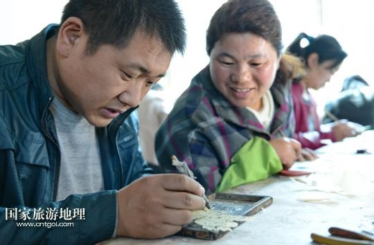 國家旅游地理 河北唐山4月2日訊 郭寶在檢查一件皮影藝術(shù)品的雕刻質(zhì)量(3月30日攝)。河北省遷安市趙店子鎮(zhèn)馬古寺村村民郭寶自幼喜歡皮影雕刻,師承當(dāng)?shù)氐窨趟嚾送跽淅舷壬?,他雕刻的影人造型古樸、工藝精?xì),深受皮影收藏愛好者的歡迎。2003年,郭寶成立了“郭寶皮影傳承工作室”,并從村里招來20多位喜歡皮影藝術(shù)的農(nóng)民專門從事皮影雕刻。經(jīng)過幾年的發(fā)展,如今郭寶皮影工作室開發(fā)設(shè)計皮影工藝品3000余種,在傳承保護(hù)唐山皮影的同時還獲得了豐厚的收入。 /新華社記者楊世堯攝