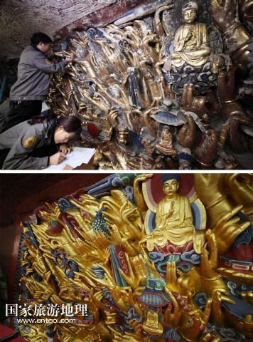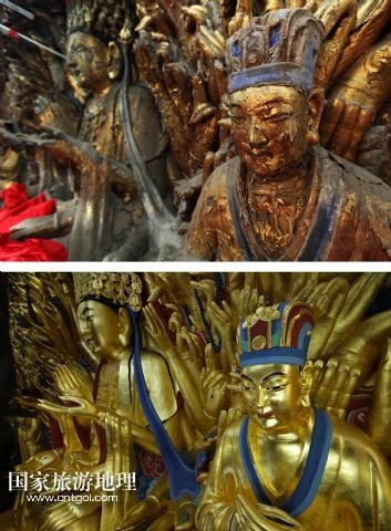 國(guó)家旅游地理 重慶6月13日訊 修復(fù)前后的重慶大足千手觀音造像局部(拼版照片,上圖上:2011年2月24日攝,上圖下:2015年3月31日攝)。